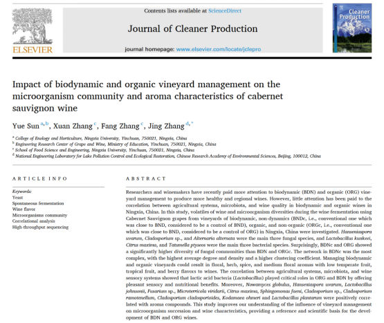近日,公司zoty中欧孙悦副教授在国际顶级期刊《Journal of Cleaner Production》(1区TOP期刊,IF为9.7)在线发表题为 “ Impact of biodynamic and organic vineyard management on the microorganism community and aroma characteristics of cabernet sauvignon wine ” 的研究论文。孙悦为第一作者,zoty中欧官方网站为第一单位。