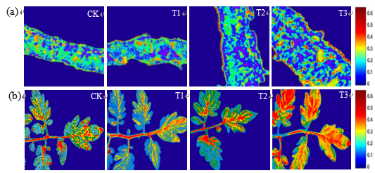 图2 番茄叶片中SOD分布的可视化。(a)微观预测模型;(b)宏观预测模型。