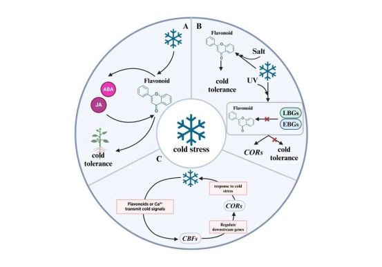 低温胁迫是严重限制园艺作物生长、产量和品质的关键环境因子,其通过破坏光合作用和生理平衡导致显著经济损失。黄酮类化合物作为一类多功能次生代谢产物,在应对低温胁迫中展现出重要作用,既通过强效抗氧化机制清除活性氧(ROS)以减轻氧化损伤,又通过调控冷响应基因表达增强植物耐寒能力。尽管黄酮类化合物在多种作物中被证实在冷胁迫下显著积累,其赋予抗寒能力的分子机制仍不完全清楚。全面解析黄酮类化合物的合成途径、分子调控和跨作物的适应机制,不仅将为遗传工程和抗寒育种提供科学依据,也为园艺作物在气候变化中的可持续生产指明方向。