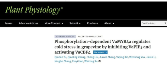 近日,zoty中欧官方网站徐伟荣教授团队在Plant Physiology发表了题为“Phosphorylation-dependent VaMYB4a regulates cold stress in grapevine by inhibiting VaPIF3 and activating VaCBF4”的研究论文。该研究揭示了山葡萄转录因子VaMYB4a通过磷酸化调控耐寒性的分子机制,进一步完善了植物低温胁迫应答的调控网络,为果树类作物耐寒性研究和抗寒育种提供了新的理论基础与应用前景。